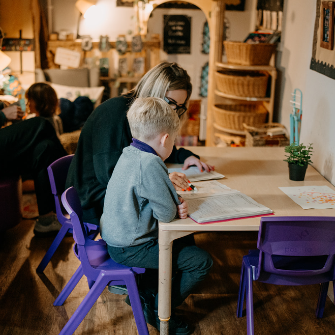 Communication and language sit at the heart of everything we do. Children develop their speaking, listening and storytelling skills through high-quality interactions, shared stories, Drawing Club, the Message Centre and Helicopter Stories.